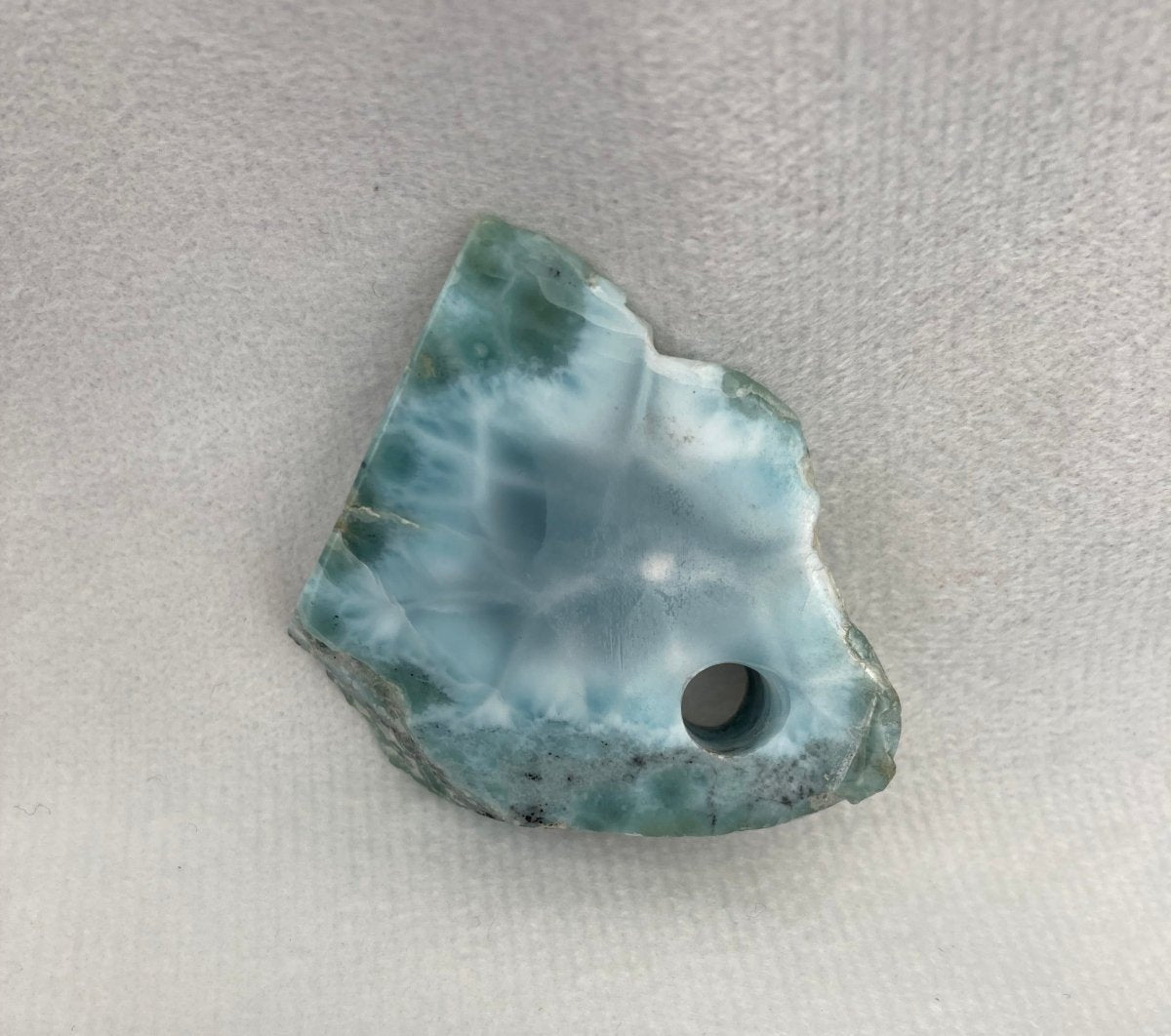 This impressive large larimar pendant weighs 39 grams and measures 1.75 inches in height, 1.40 inches in width, and 0.40 inches in thickness. The mineral itself boasts a stunning blue hue that adds to its overall charm and appeal, making it a striking accessory that is sure to catch the eye. The pendant displays some patterns of deep green colour.