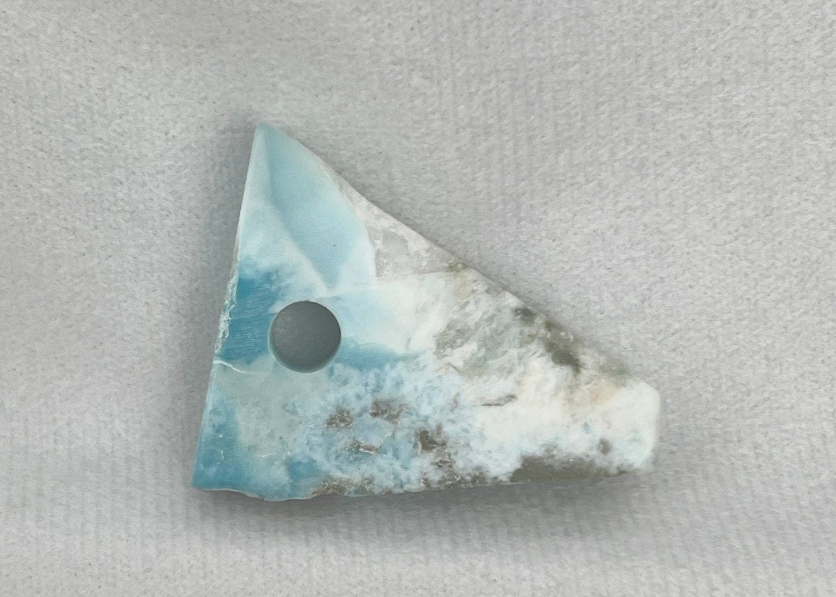 This larimar crystal pendant weighs 20 grams and measures 1.50 inches in length, 1.25 inches in width, and 0.40 inches in thickness. This piece is medium, and its design features a triangular shape that enhances its visual appeal.