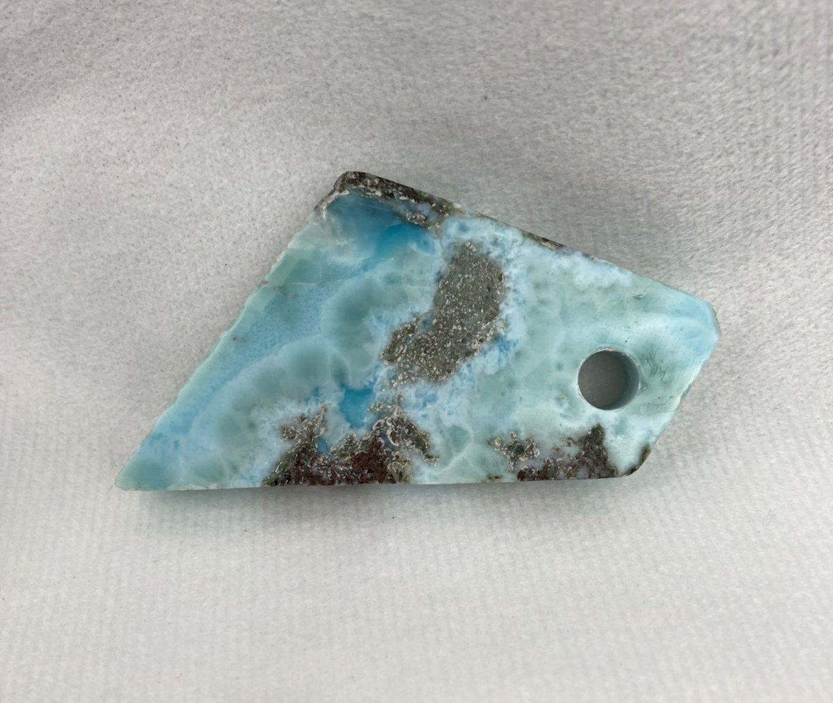 Whether used to elevate an elegant ensemble or paired with a casual outfit, this large larimar pendant is sure to spark conversation and catch the eye.