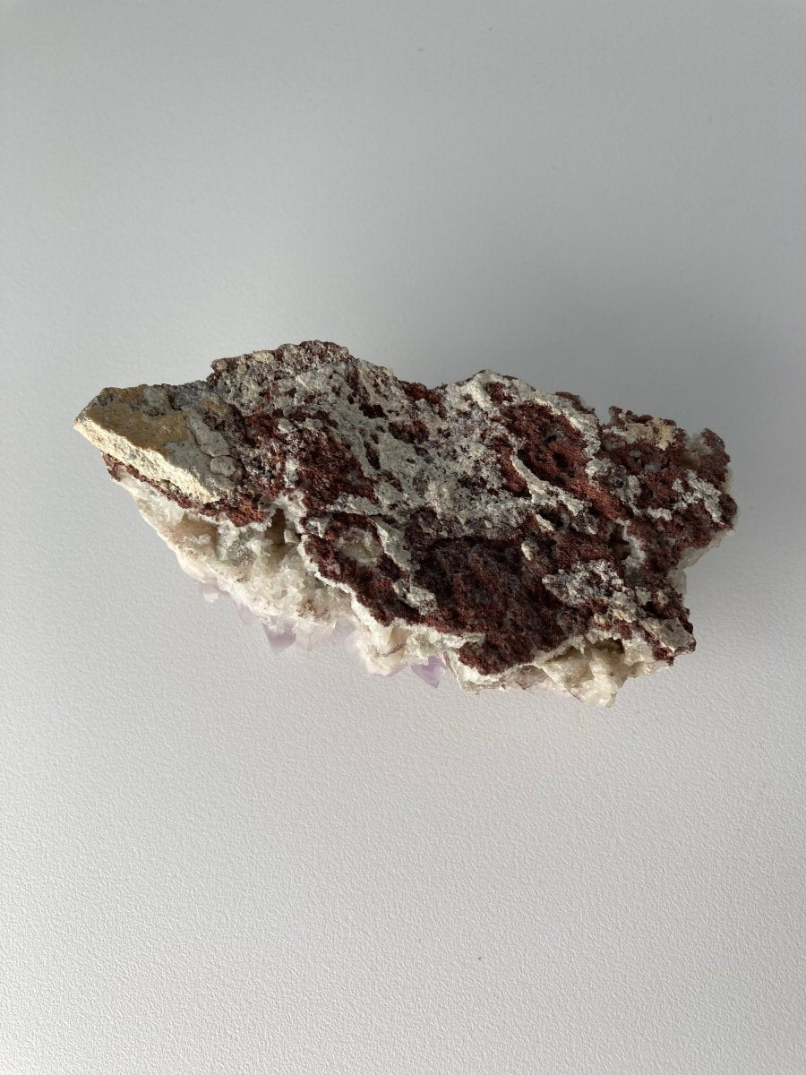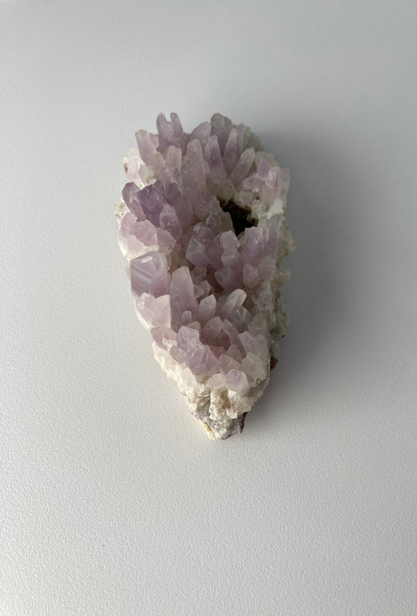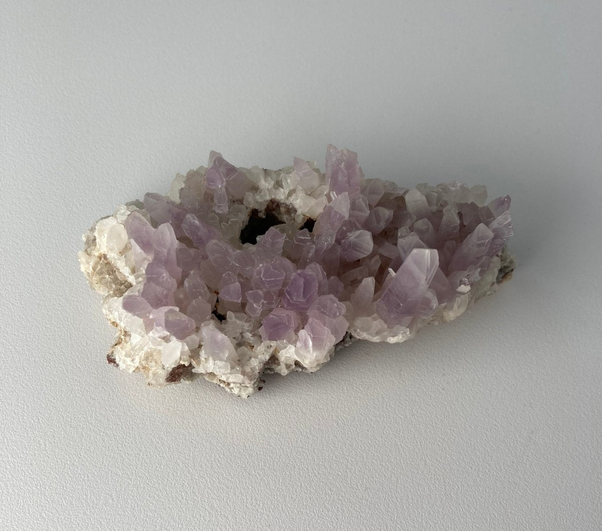 This authentic amethyst crystal, with its elongated shape and a small hole near the centre, has an original appearance. This unique natural design sets it apart from more common specimens, enhancing its visual appeal. Weighing in at 127 grams, this lilac amethyst crystal exudes an air of elegance.