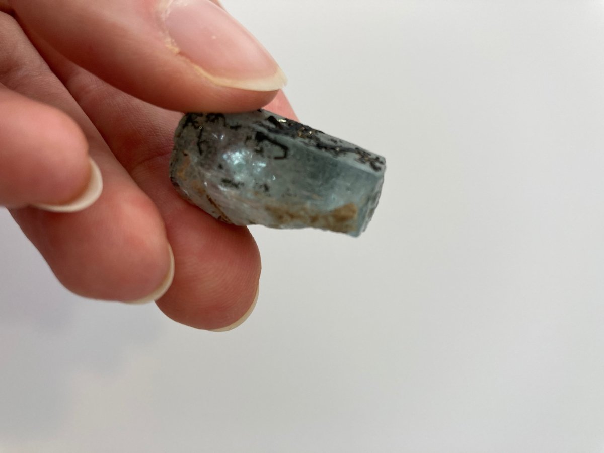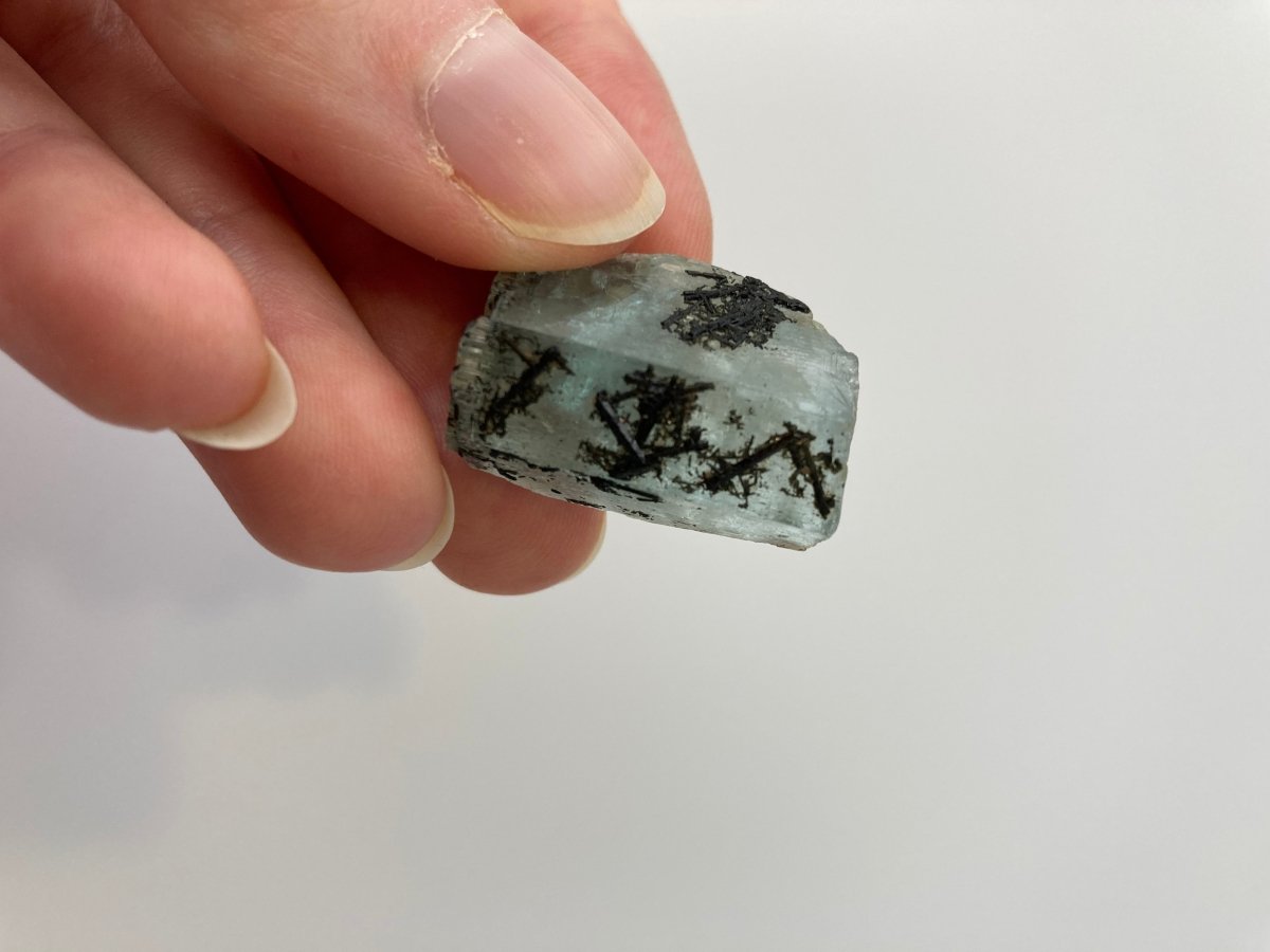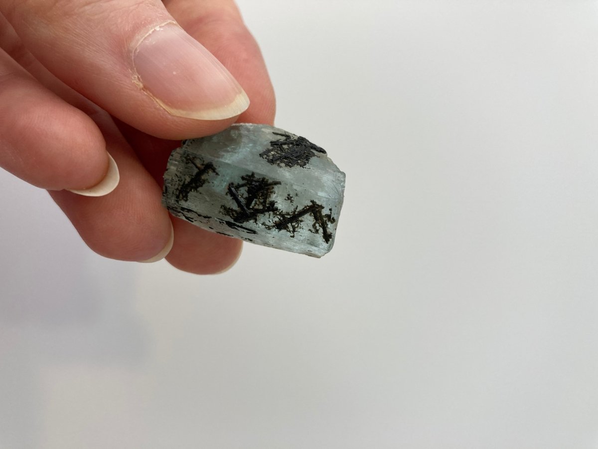 This remarkable natural aquamarine crystal features black tourmaline that creates a captivating contrast against its blue hue. The intricate patterns of black tourmaline at the front of the crystal effortlessly draw the viewer's attention, making it a standout piece. One side of the aquamarine from Namibia showcases more black tourmaline than the other side, adding to the crystal's asymmetrical charm.