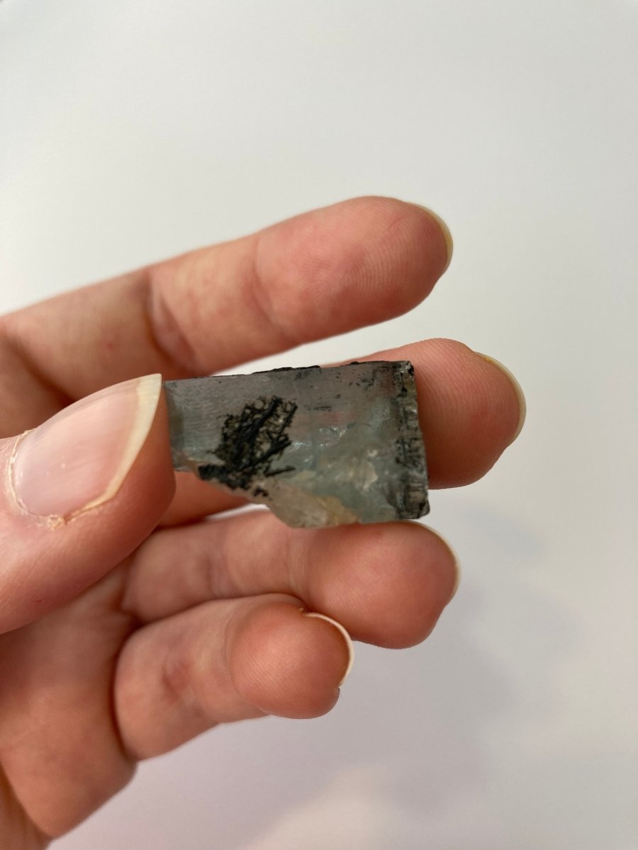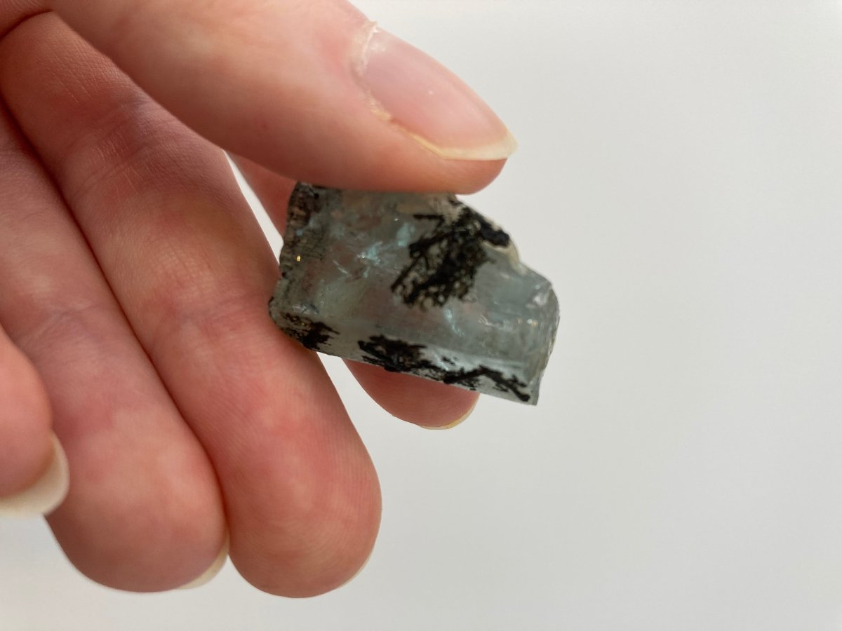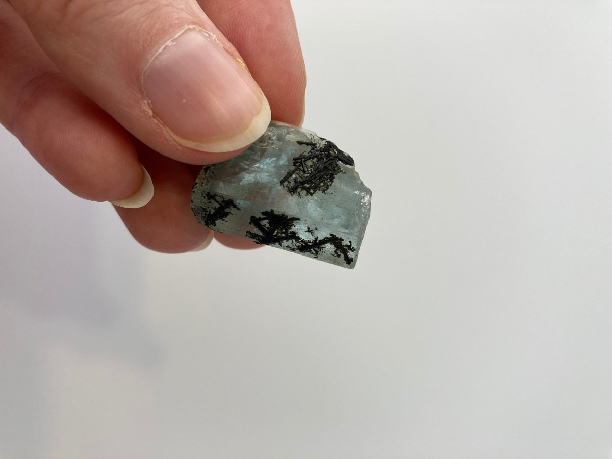 This remarkable natural aquamarine crystal features black tourmaline that creates a captivating contrast against its blue hue. The intricate patterns of black tourmaline at the front of the crystal effortlessly draw the viewer's attention, making it a standout piece. One side of the aquamarine from Namibia showcases more black tourmaline than the other side, adding to the crystal's asymmetrical charm.
