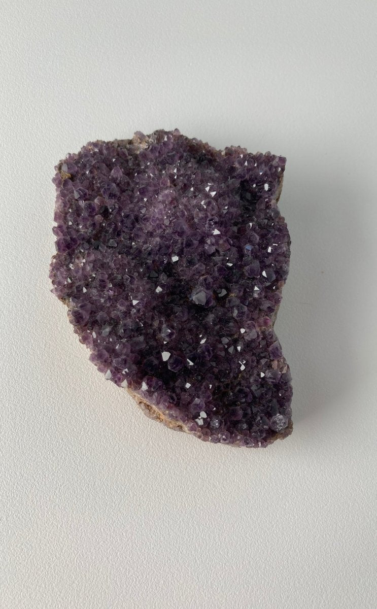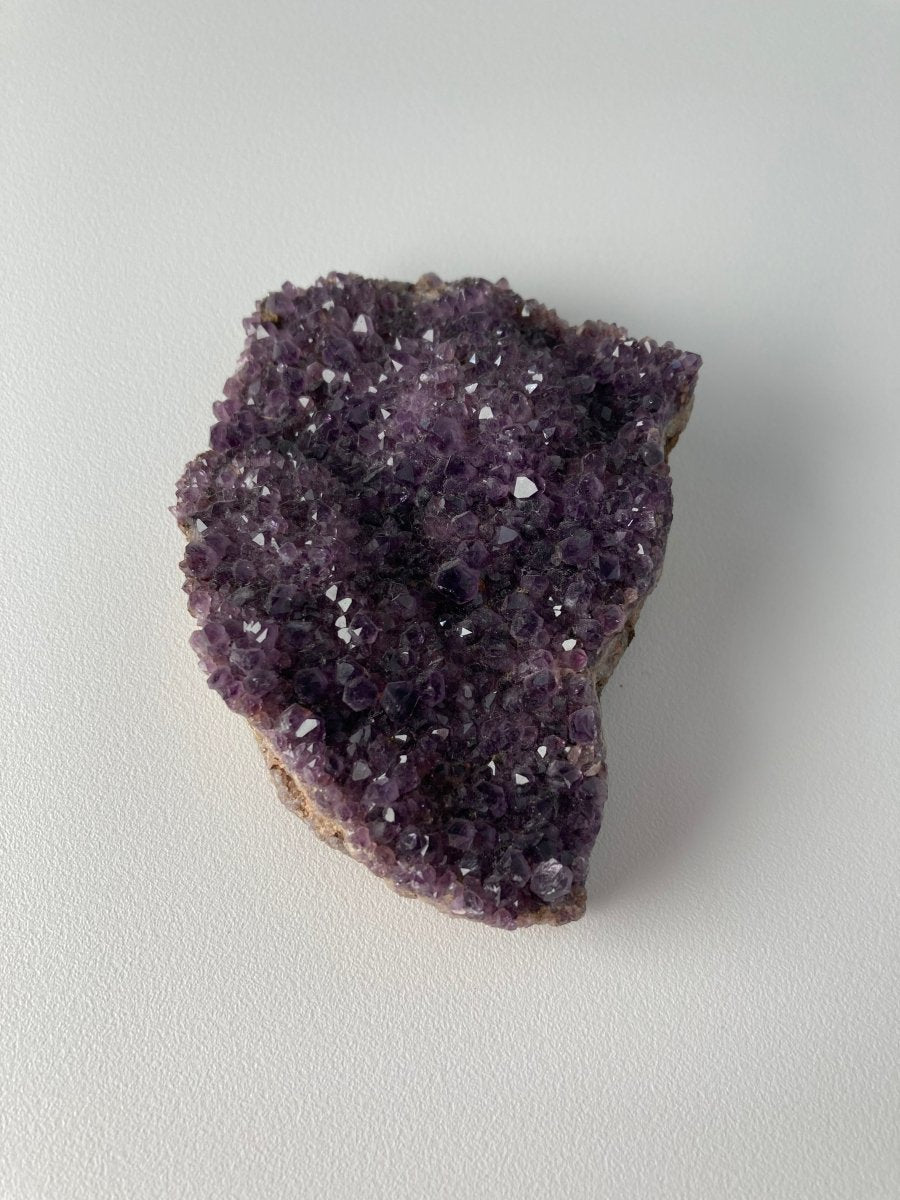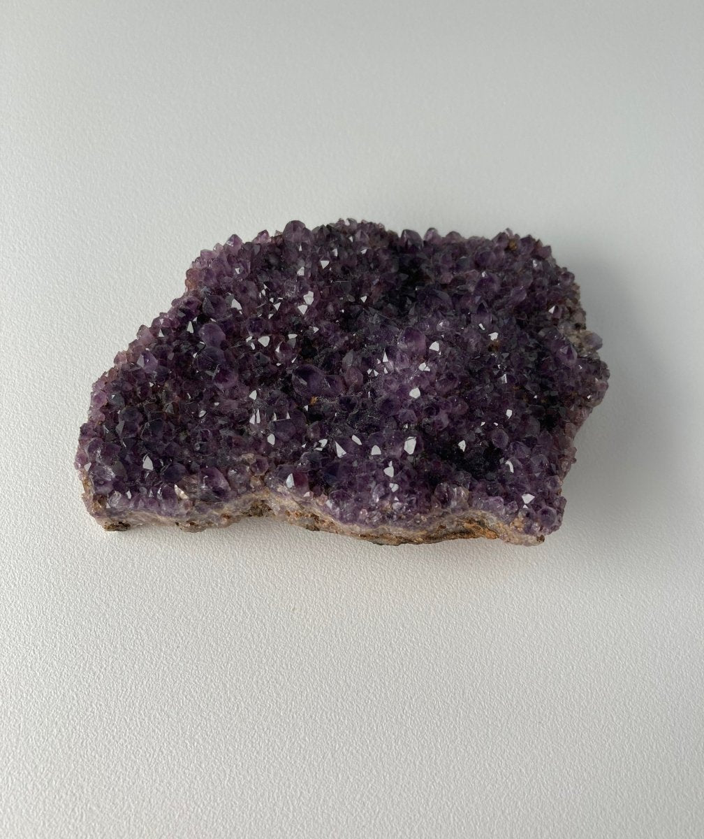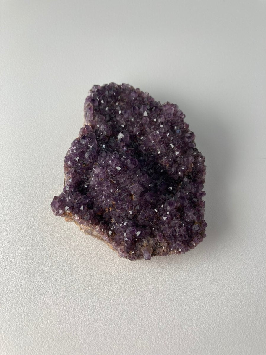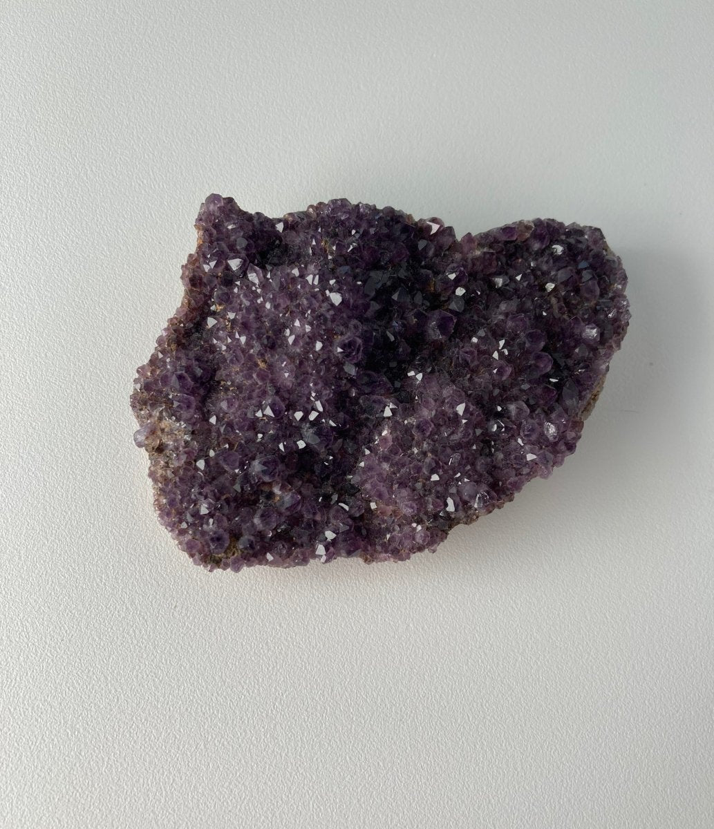 To truly showcase the enchanting purple hue of this purple amethyst rock, consider positioning it on a vibrant yellow or warm orange surface. The contrast will bring out its rich colour beautifully. Additionally, surrounding the crystal with yellow or orange companions, such as the sunny glow of sunstone or the radiant citrine, will further enhance its visual appeal. This thoughtful arrangement will create a stunning display that highlights the crystal's captivating purple tones.