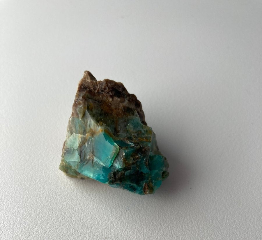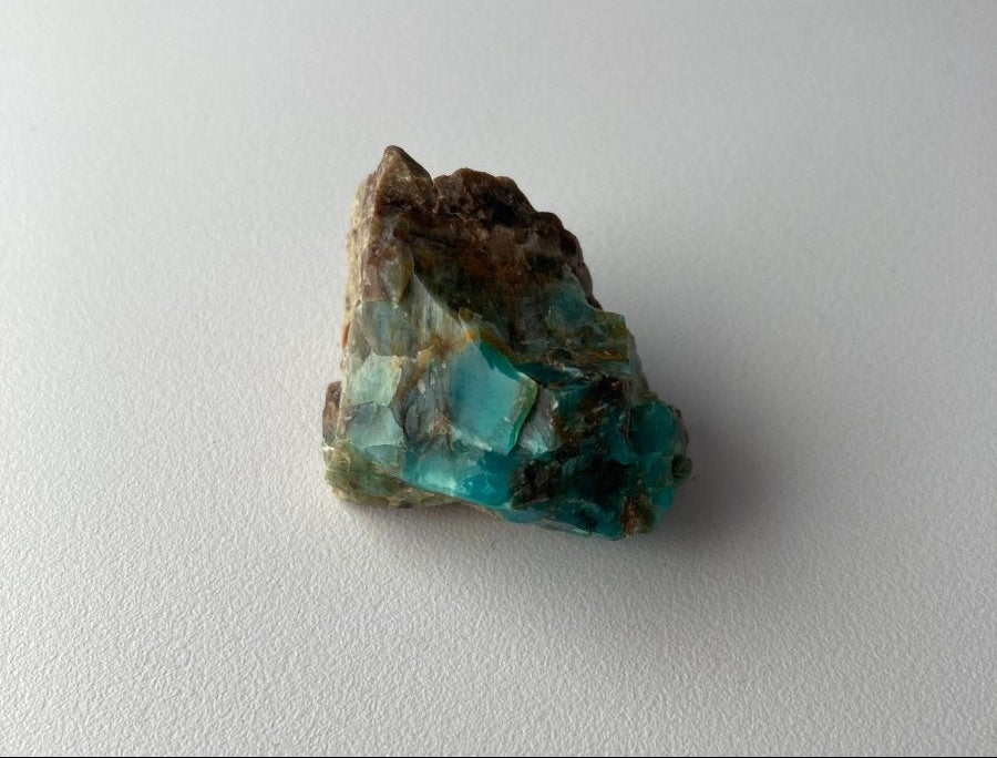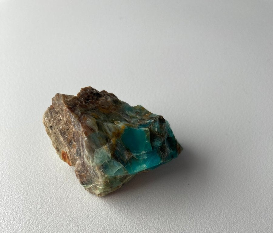 If you want to make a bold statement, try placing this rough colla wood specimen on an orange cloth. This contrasting pairing will make the blue hues of the crystal pop, capturing attention and serving as a vibrant focal point in any room.