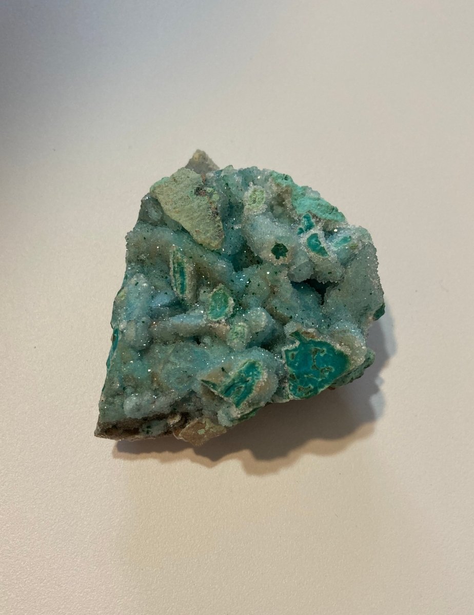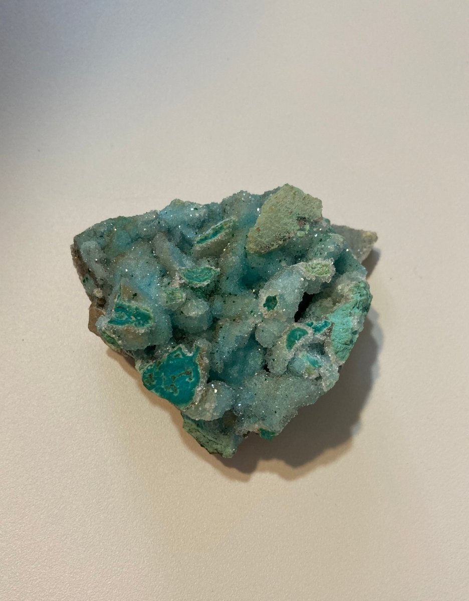 Этот потрясающий кристалл хризоколлы своими пленительными цветами напоминает о безмятежности океана. Нежные оттенки синего напоминают о безмятежных водах, а спокойный белый слой поверх него добавляет глубину и интерес к его внешнему виду. Гармоничное сочетание белого и синего создает успокаивающий эффект, усиливая умиротворяющее воздействие синей хризоколлы и умиротворяя ваши чувства.