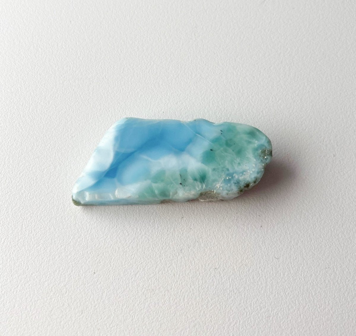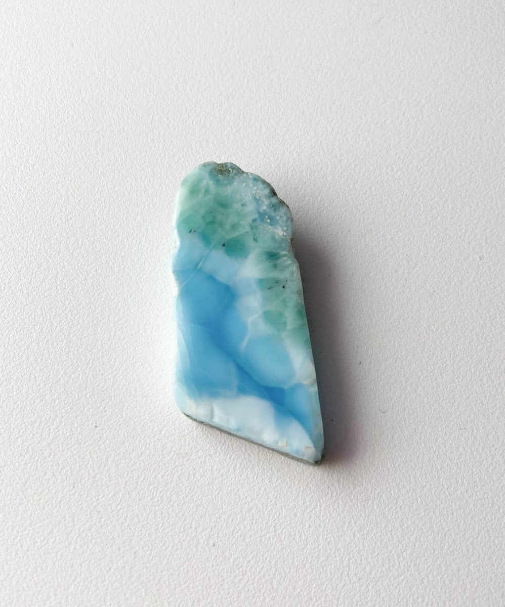 Обратная сторона этого полудрагоценного камня из Доминиканской Республики демонстрирует завораживающее сочетание цветов, которые, сливаясь воедино, образуют характерный и замысловатый узор. Присутствует зеленоватый оттенок, придающий дизайну органичность, а средний оттенок синего добавляет глубины и спокойствия.