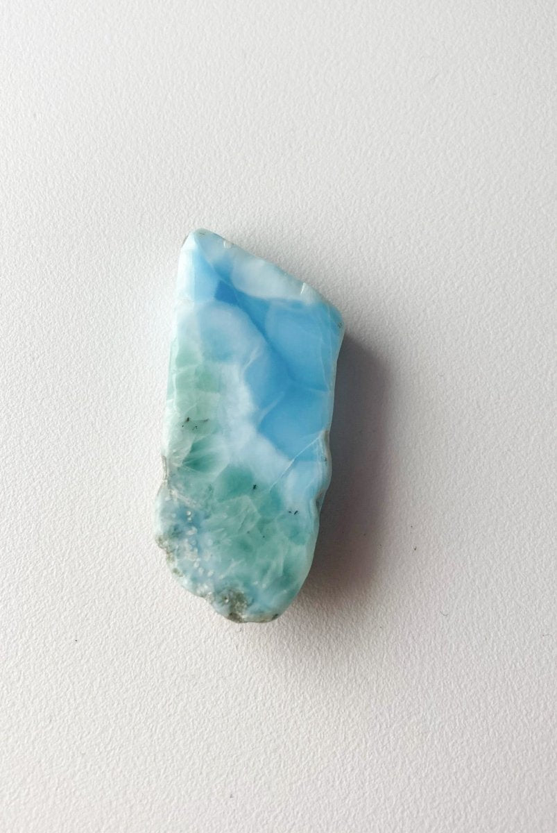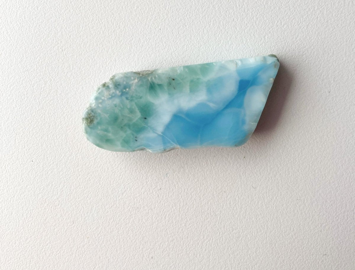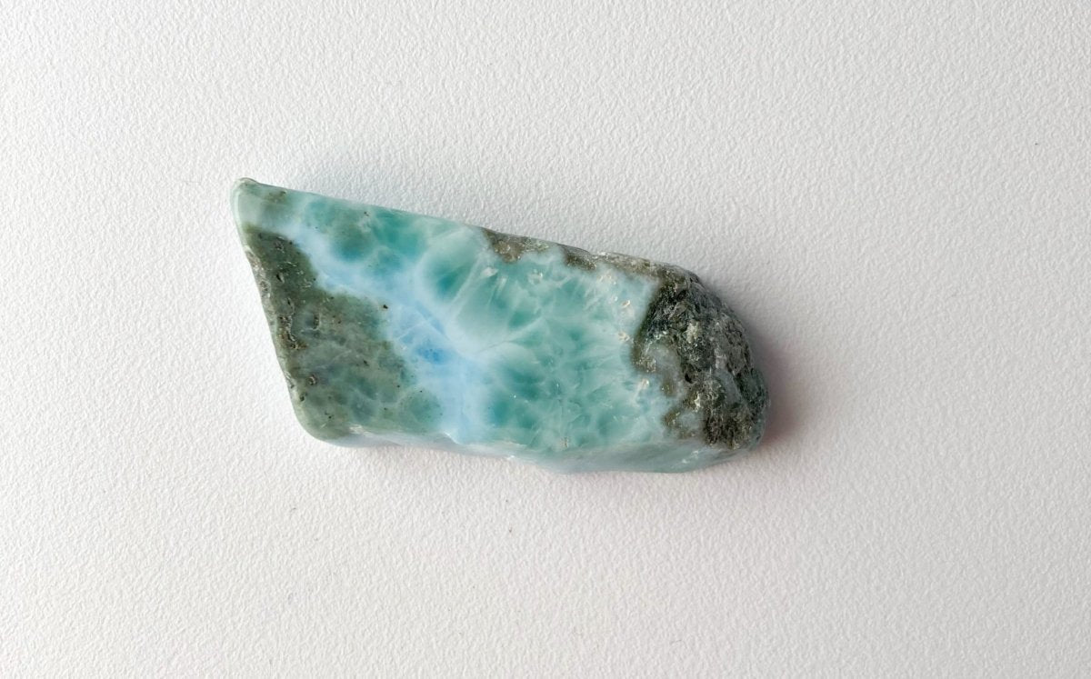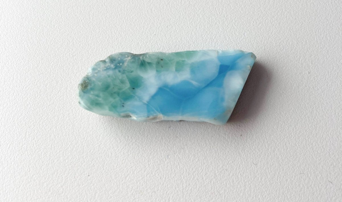 Наконец, можно положить этот синий камень из Доминиканской Республики на белую поверхность. Это эффективно подчеркнет зеленый оттенок кристалла. Выбрав такой фон, вы сможете выделить тонкий баланс цветов внутри кристалла, привлекая внимание к его стабилизирующим свойствам.