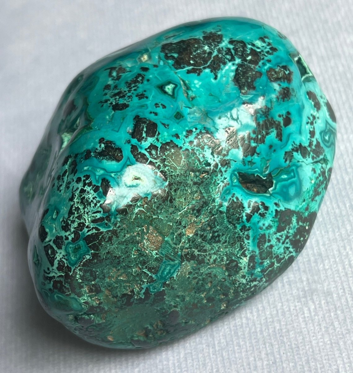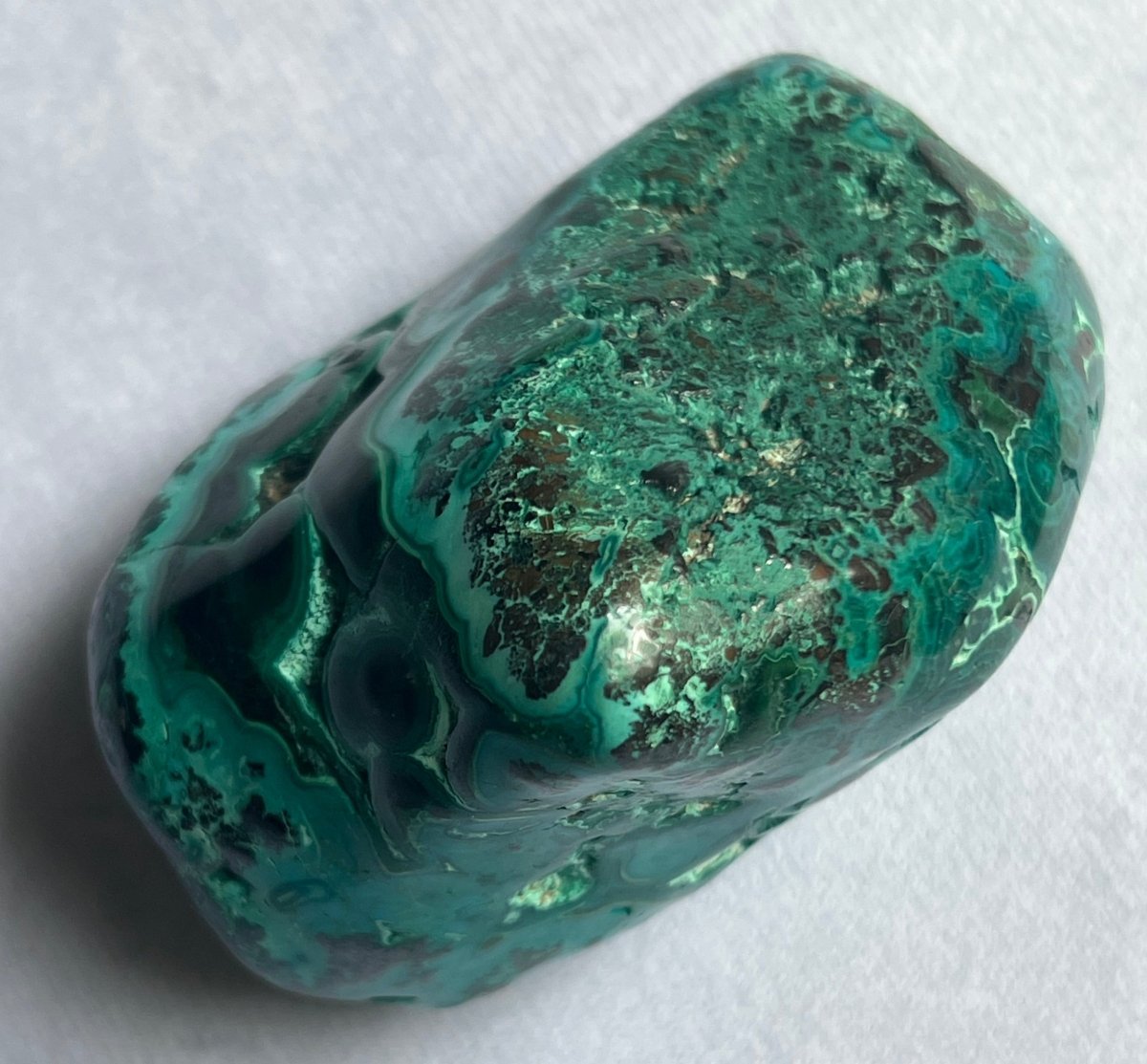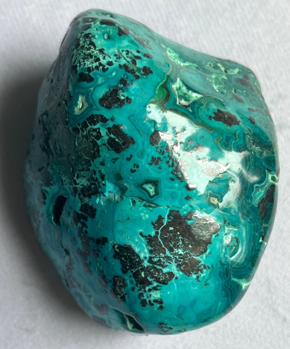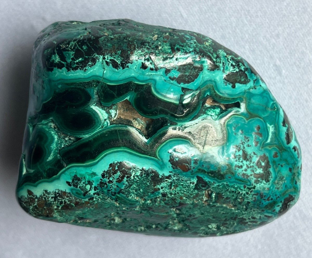 Яркие оттенки и замысловатые узоры хризоколлового малахита создают притягивающий взгляд вид, добавляя ему привлекательности, когда его держат в руках или выставляют напоказ.