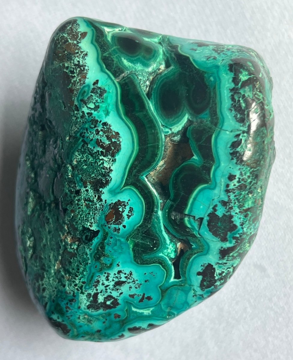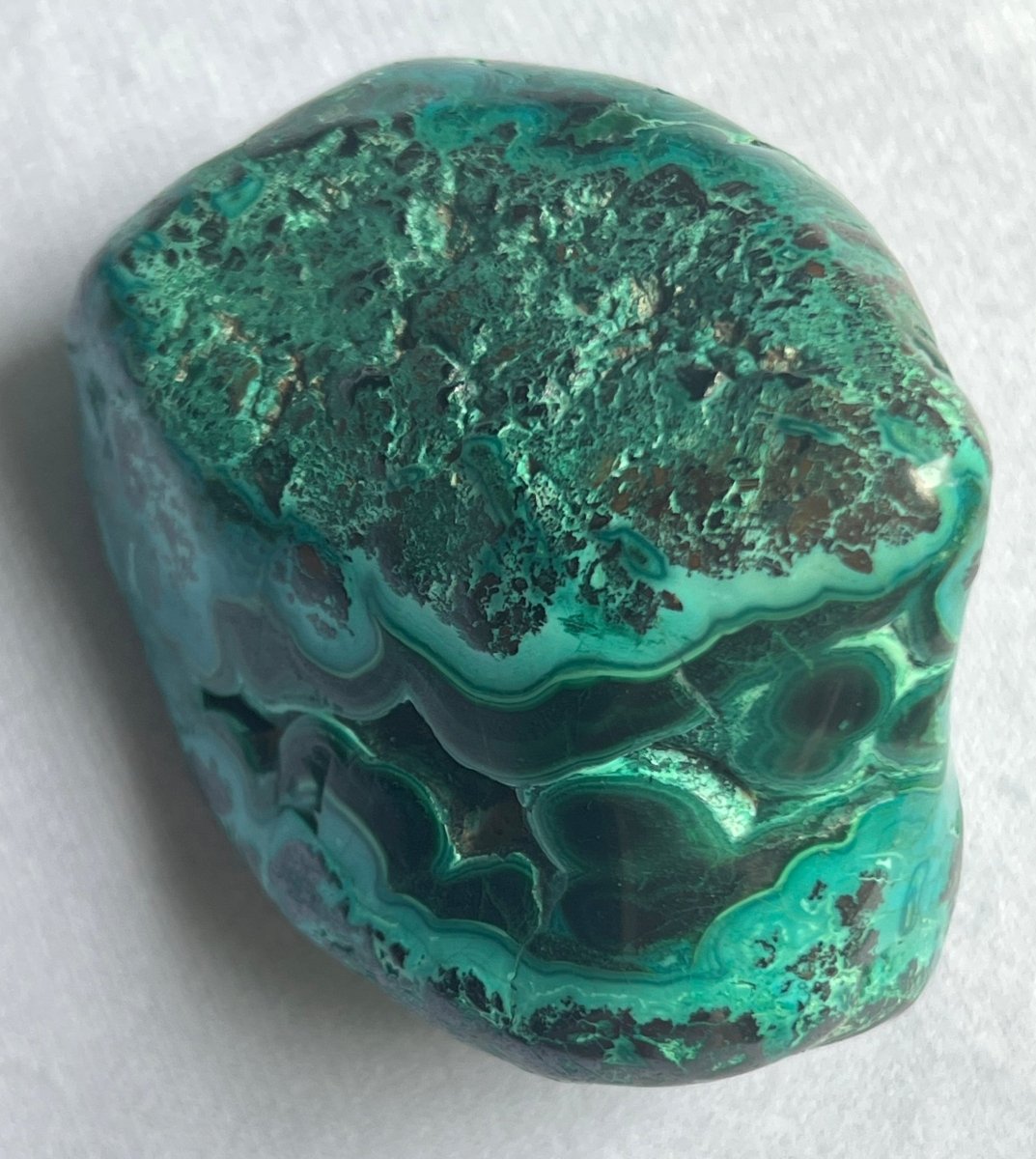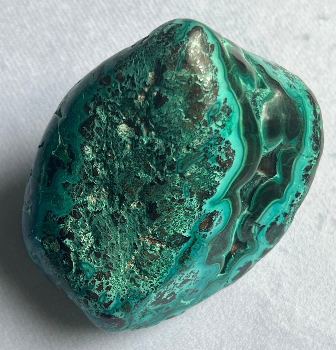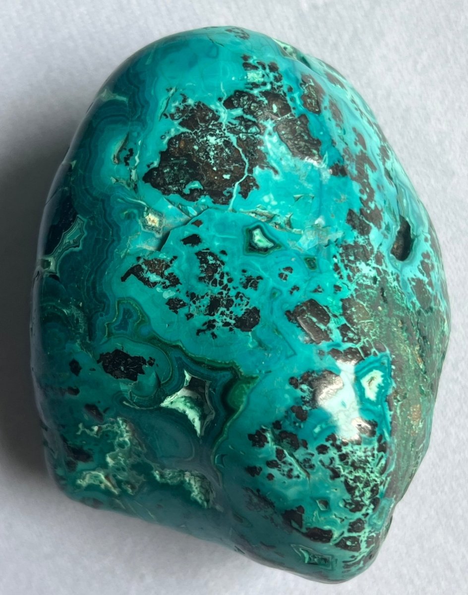 Яркие оттенки и замысловатые узоры хризоколлового малахита создают притягивающий взгляд вид, добавляя ему привлекательности, когда его держат в руках или выставляют напоказ.