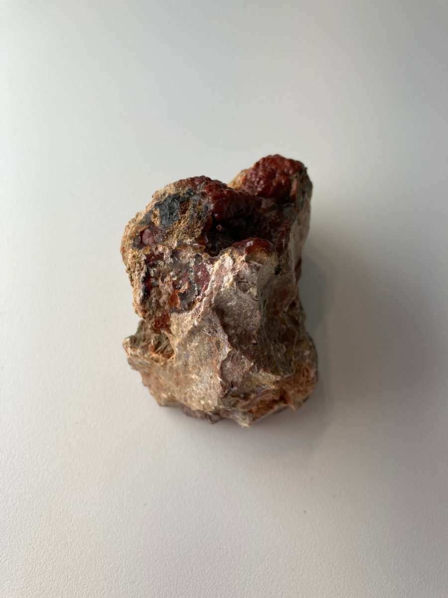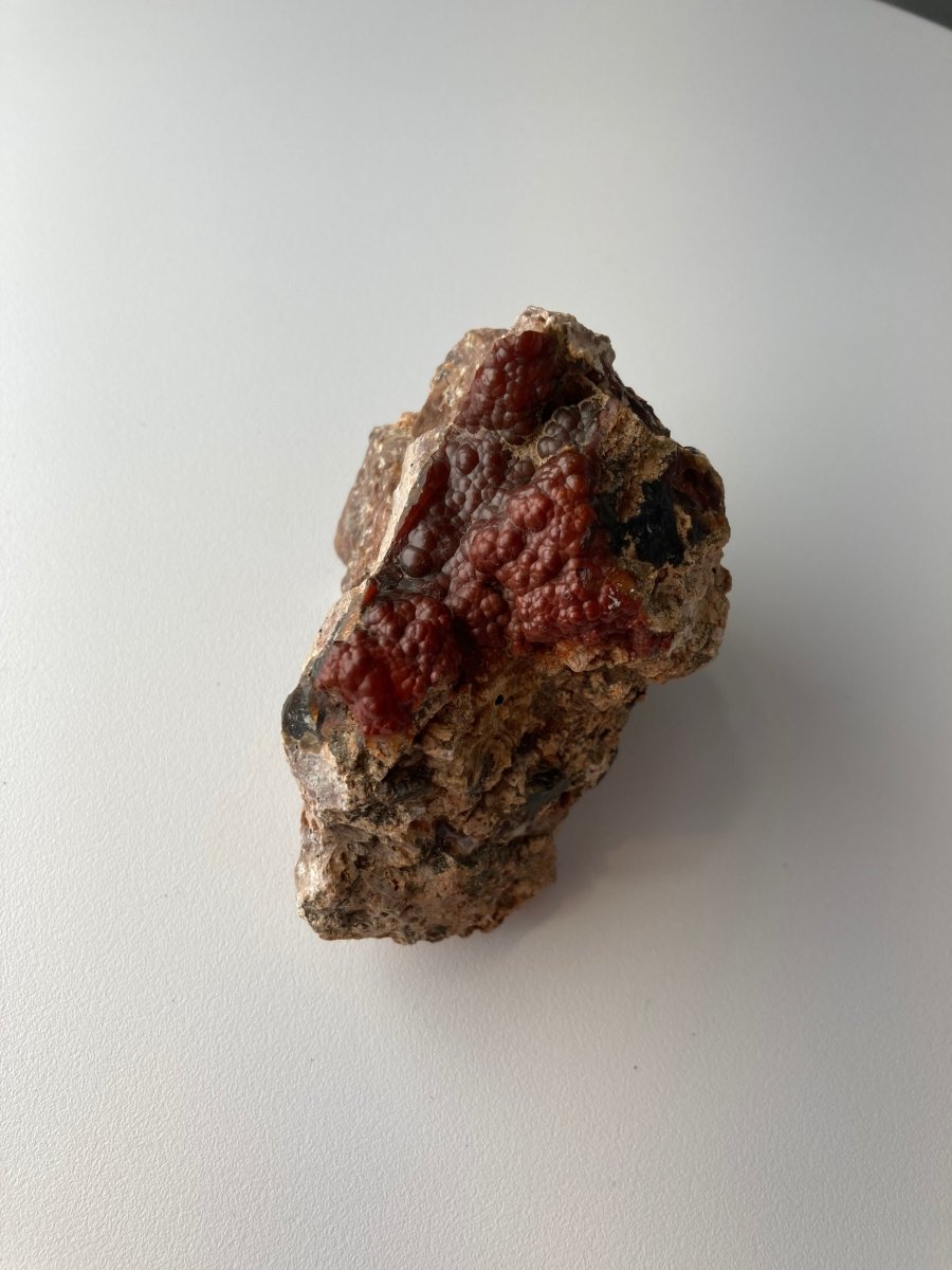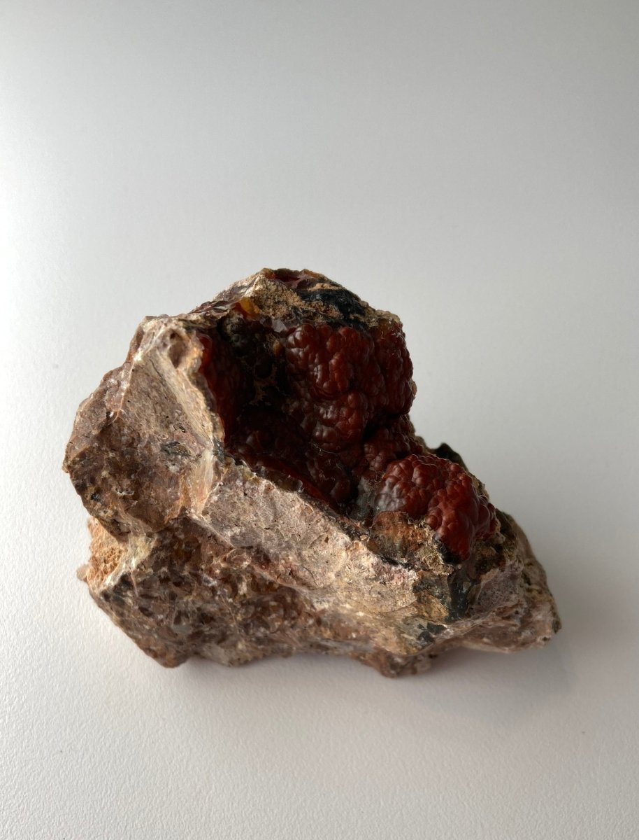 Сам гематит имеет насыщенный, глубокий красный цвет . Этот насыщенный красный цвет прекрасно контрастирует с грубой, землистой основой агата , где природные текстуры и необработанные минеральные поверхности придают изделию основательность и органичность. Грубый камень под ним создает нейтральный, выветренный фон, позволяя гематиту ярко сиять и наполняя лицевую сторону изделия теплом и глубиной.