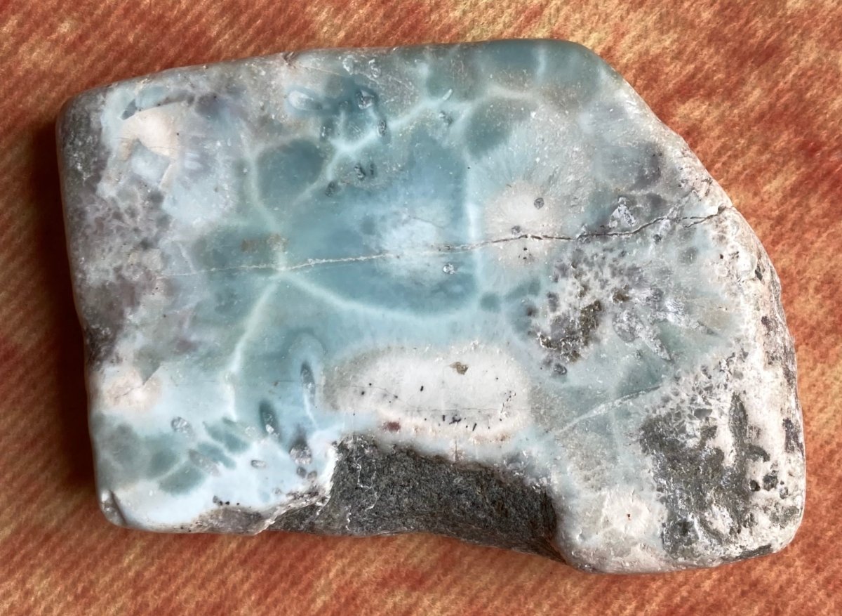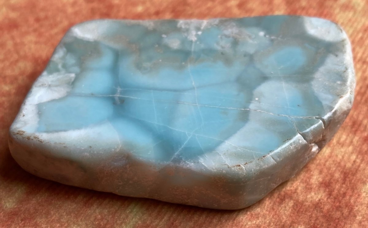 Обратная сторона этого ларимара имеет более мягкий голубой оттенок по сравнению с лицевой. В итоге лицевая сторона кристалла более яркая и насыщенная, чем оборотная. Кроме того, оборотная сторона украшена небольшими вкраплениями землистых тонов, которые придают камню текстуру и глубину.