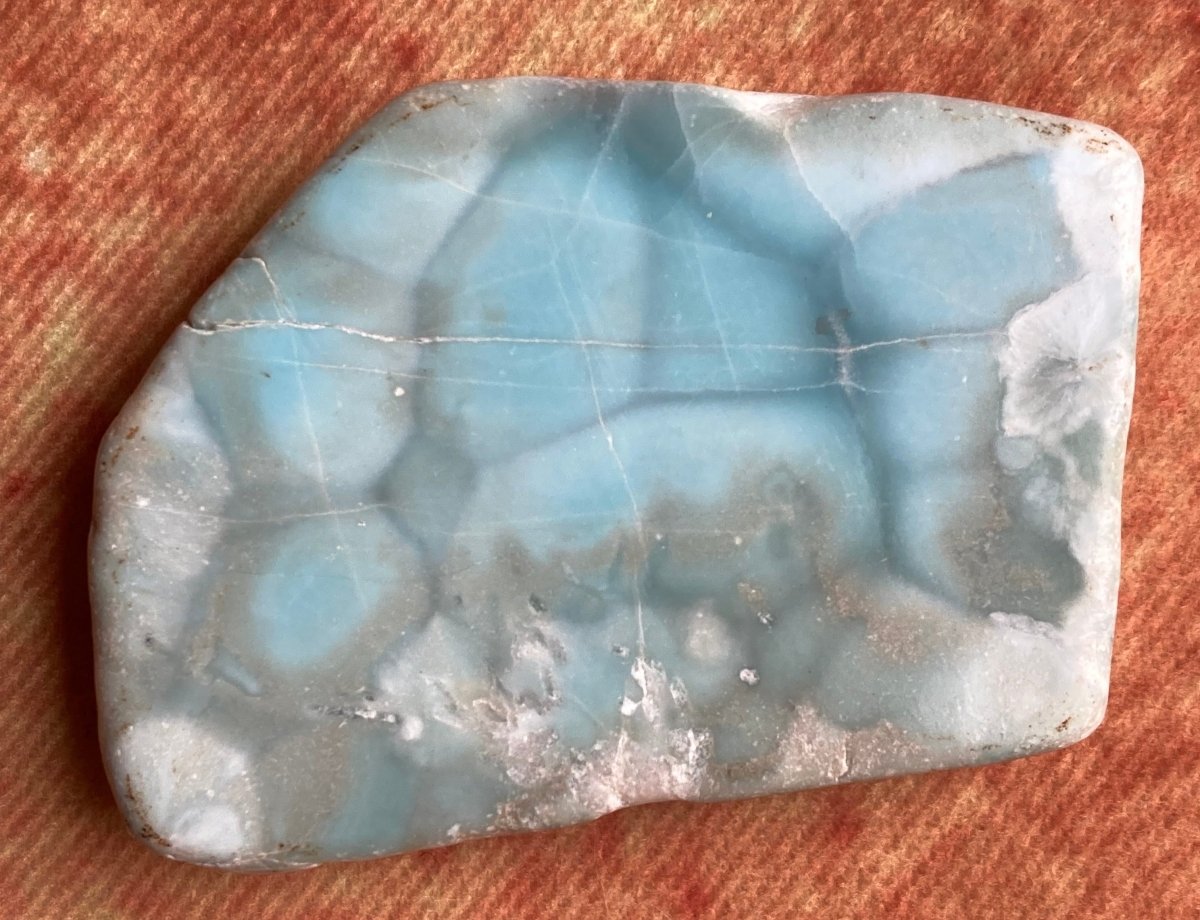 Этот замечательный камень, добываемый в Доминиканской Республике, отличается насыщенным синим оттенком в центре и ближе к центру. По мере приближения к краям оттенок постепенно ослабевает. Однако значительная часть лицевой поверхности этого доминиканского камня имеет красивый синий оттенок, который придаёт минералу глубину и выразительность.