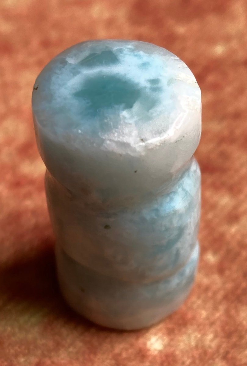 Этот настоящий кристалл ларимара, форма которого напоминает фигуру пешки из шахматной партии, отличается исключительно гладкой поверхностью. Это свидетельствует о тщательной полировке, которая повышает его эстетическую привлекательность и делает его приятным на ощупь. Прикосновение, способствующее благополучию.