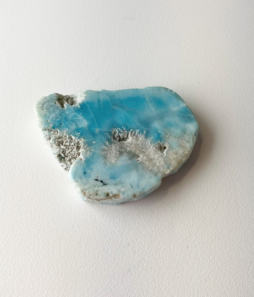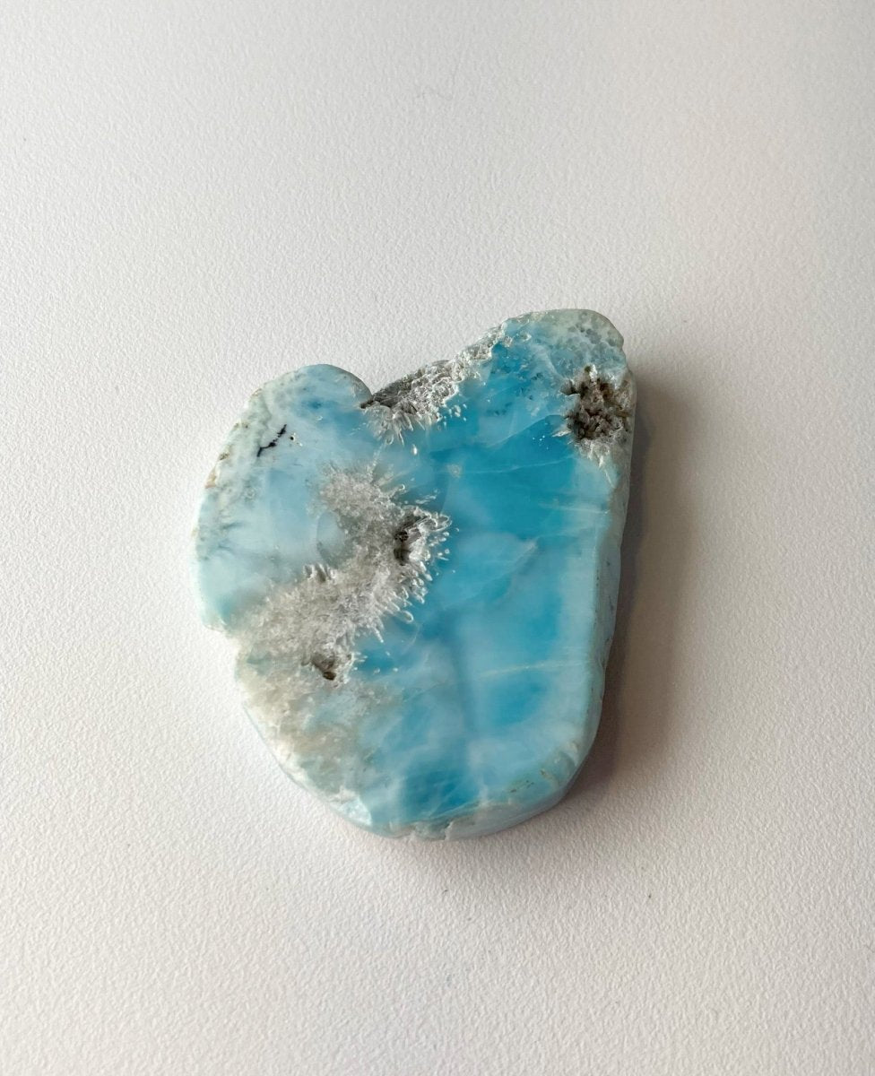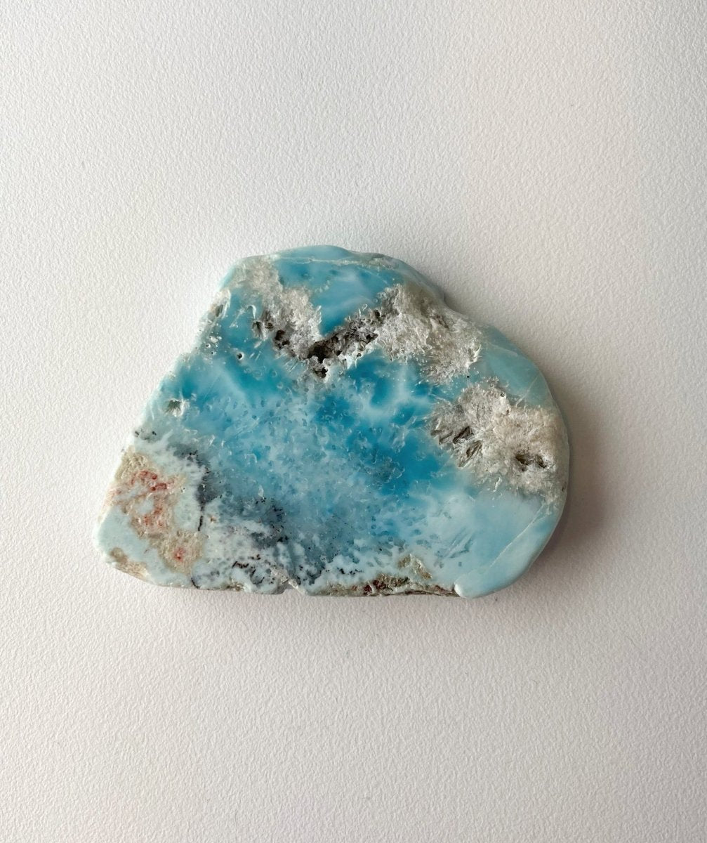 Кроме того, синий оттенок в некоторых местах на обратной стороне ларимара из Доминиканской Республики по мере приближения к краям становится светлее, создавая эффект, подчёркивающий красоту кристалла. Это изменение цвета придаёт изделию глубину и сложность, делая его поистине выдающимся.