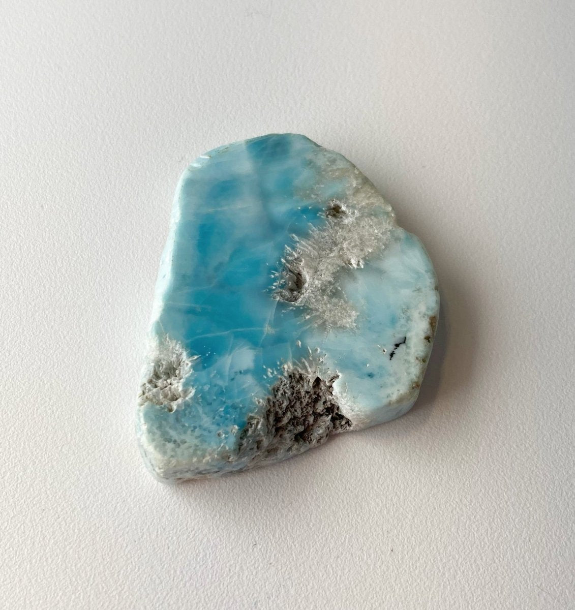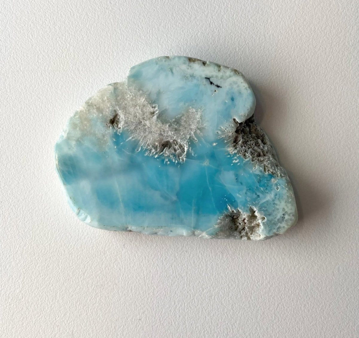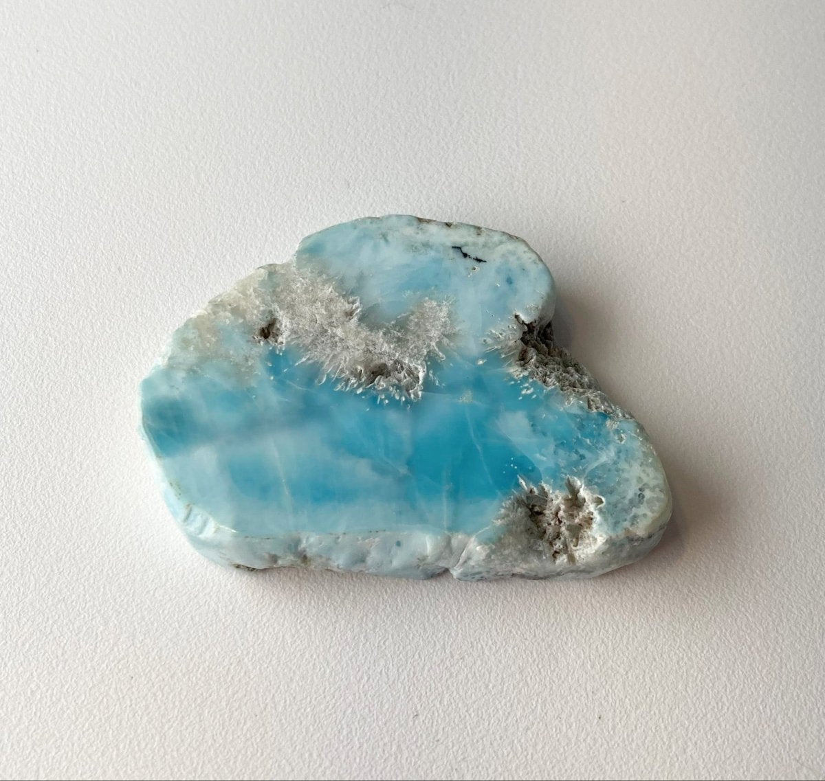Кроме того, синий оттенок в некоторых местах на обратной стороне ларимара из Доминиканской Республики по мере приближения к краям становится светлее, создавая эффект, подчёркивающий красоту кристалла. Это изменение цвета придаёт изделию глубину и сложность, делая его поистине выдающимся.